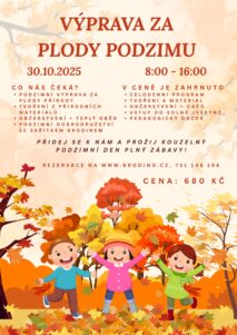 Vydejte se s námi objevovat krásy podzimní přírody! Čeká nás výprava za plody podzimu, tvoření z přírodních materiálů, podzimní dobrodružství se skřítkem Brodinem a samozřejmě chutné občerstvení i teplý oběd.