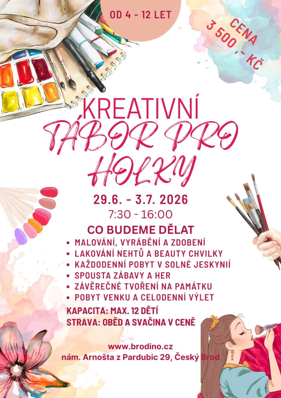 Týden plný malování, tvoření, zdobení a kreativní zábavy v přátelské atmosféře. Čekají nás beauty chvilky, hry, pobyt venku i společné tvoření, na které si holky odnesou vlastní památku.